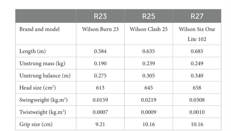 2023年,一篇學術研究針對青少年選手在使用不同長度的網球拍進行平擊發球(flat serve)時,對運動表現及身體的影響做了一系列的探討,研究中使用了23吋、25吋及27吋3種不同長度的網球拍(如表一),其中27吋為標準長度,也就是我們平常最常見到的球拍尺寸。研究結果發現,不同球拍長度對發球速度及拍頭速度沒有顯著的影響,但較長的球拍會顯著增加肩膀的內旋扭矩以及手肘內翻扭力,這意味著關節負荷也隨之增加。在上半身運動學中,較短的球拍會顯著增加前臂的最大旋前速度,以及肘部伸展速度及手腕彎曲速度,且不會降低發球速度,這代表著使用尺寸較小的球拍時,能在不降低表現的前提下,減少上半身關節的負荷,這能帶給使用者相當大的幫助,其中以8~11歲的使用者的影響最為顯著,因為在力量不足時,常會透過簡化擊球動作或漸少球拍尺寸來減少上半身負荷,同時提升學習效果;而在下肢運動學方面,多項研究皆顯示較長的球拍會增加最大前膝屈曲角度、增加最大後膝伸展速度及增加最大前髖伸展速度,表示尺寸較大的球拍,對下半身的活動度及肌力活化是有幫助的。
