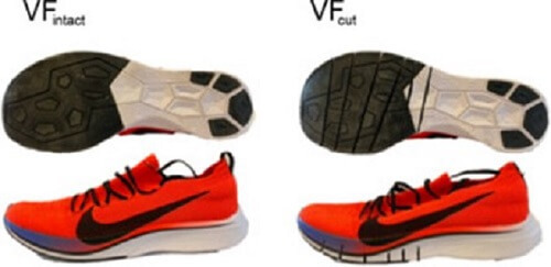 這項研究招募了17名有規律跑步習慣的男性受試者,並讓受試者隨機穿著兩雙不同條件的Nike Vaporfiy,分別為無切割的Nike Vaporfly (VFintact),及另一雙切割過的Nike Vaporfly(VFcut)。他們在VFcut的前腳掌割了6條切口 (如下圖),這些切口皆完全穿過碳纖維板,並確保這些切口不會影響鞋子形狀及發泡的特性,藉此盡可能的排除掉碳纖維板可能帶來的效益。經過熱身後,他們讓受試者在測力跑步機上進行四次,每次五分鐘的14 km/h跑步,過程中同步收取每步的生物力學及生理數據,而實驗過程中每雙鞋皆使用鞋套,因此受試者無法分辨自己所穿著的鞋子是否有切割過。
