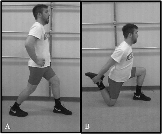 這項研究共招募了20位受試者 (男性 :9 位 ; 女性:11位),並用改良式湯馬斯測試 (Modified Thomas Test, MTT) 確認他們的髖關節被動伸展角度,隨後研究人員要求他們需完成為期三週的髖關節伸展訓練計畫,每天進行站立髖屈肌伸展和跪姿改良弓步伸展 (如下圖),每個動作需重複10次,每次維持10秒,中間休息10秒。